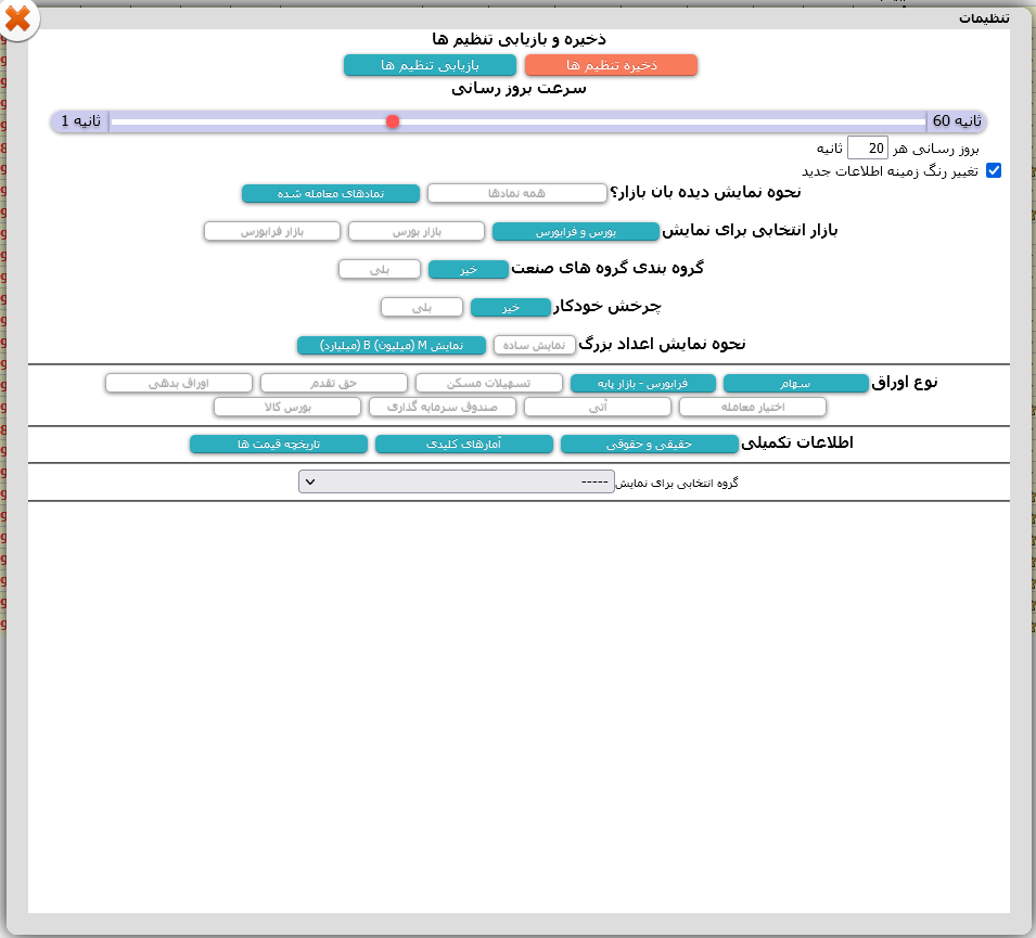 شماره دو معمولاً بیشتر فیلتر ها برای اجرای صحیح نیاز به تغییر تنظیمات دیدبان بازار دارند به عنوان مثال اگر فیلتر از سابقه معاملات استفاده می کند باید حتماً در تنظیمات گزینه سابقه معاملات فعال باشد بنابراین پیشنهاد می گردد در تنظیمات هر سه گزینه یعنی تاریخچه قیمت ها، آمار کلیدی و حقیقی و حقوقی را به صورت پیش فرض فعال کنید تا تمامی فیلتر ها بدون مشکل اجرا شوند ضمنا در تنظیمات سعی کنید در گزینه نوع اوراق فقط مواردی را فعال کنید که به آن نیاز دارید به عنوان مثال اگر شما حق تقدم یا اختیار معامله را هیچگاه معامله نمی کنید گزینه این اوراق را فعال نکنید.